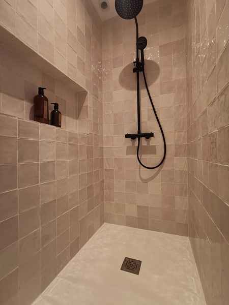 Salle de bain avec une faïence type ZELLIGE et un mobilier bois pour une ambiance chaleureuse