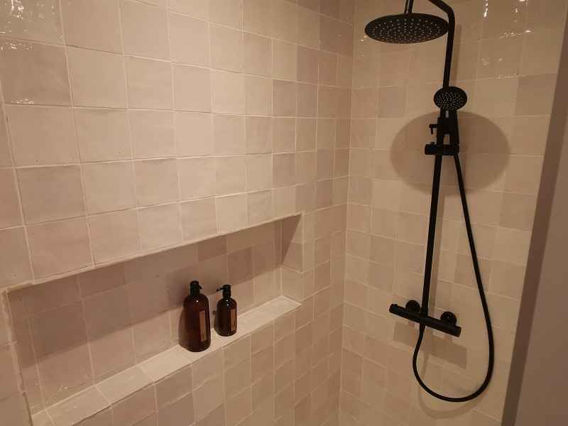 Salle de bain avec une faïence type ZELLIGE et un mobilier bois pour une ambiance chaleureuse
